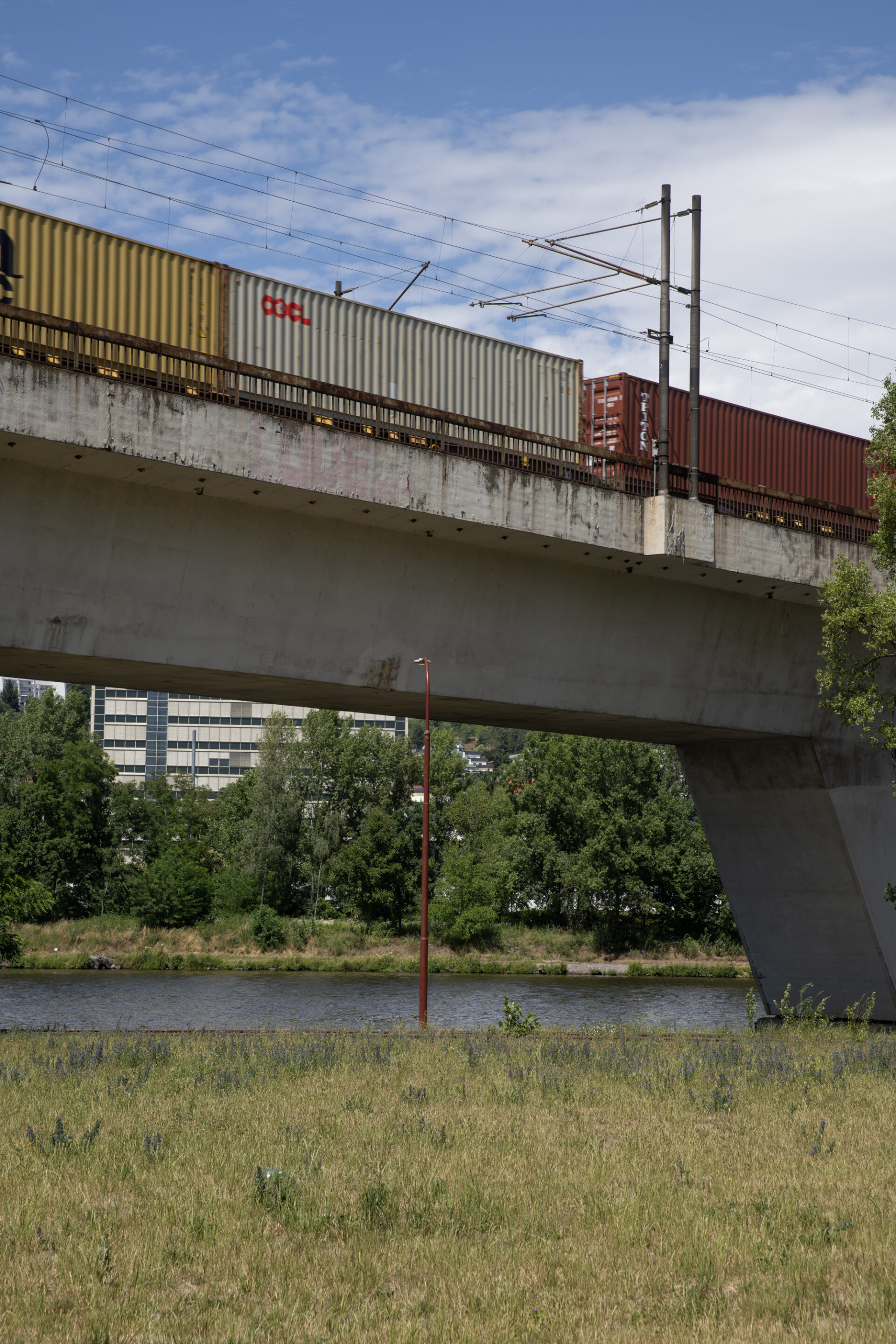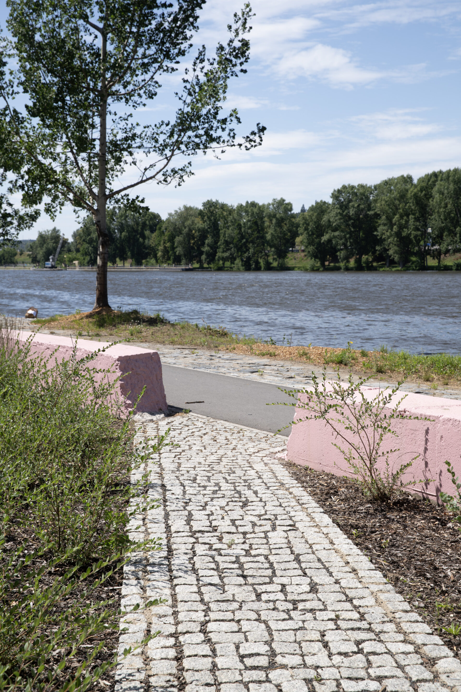 Na první pohled jako by se na holešovickém nábřeží mnoho nezměnilo. Břeh řeky stále lemují topoly, staré lampy a návěstidla, mezi betonové pražce se stále prodírá vegetace a skrz náletové dřeviny prosvítají kolejnice vlečky. Jen náhlý průřez růžovou betonovou zídkou u vstupu naznačuje, že se tu začíná něco dít. Podstatou této nové kapitoly jsou však místo výrazných gest právě subtilní zásahy. Jinými slovy, park U Vody ukazuje, jak vypadá architektonické minimum: dostatečné a zároveň citlivé.Akupunkturní architektura