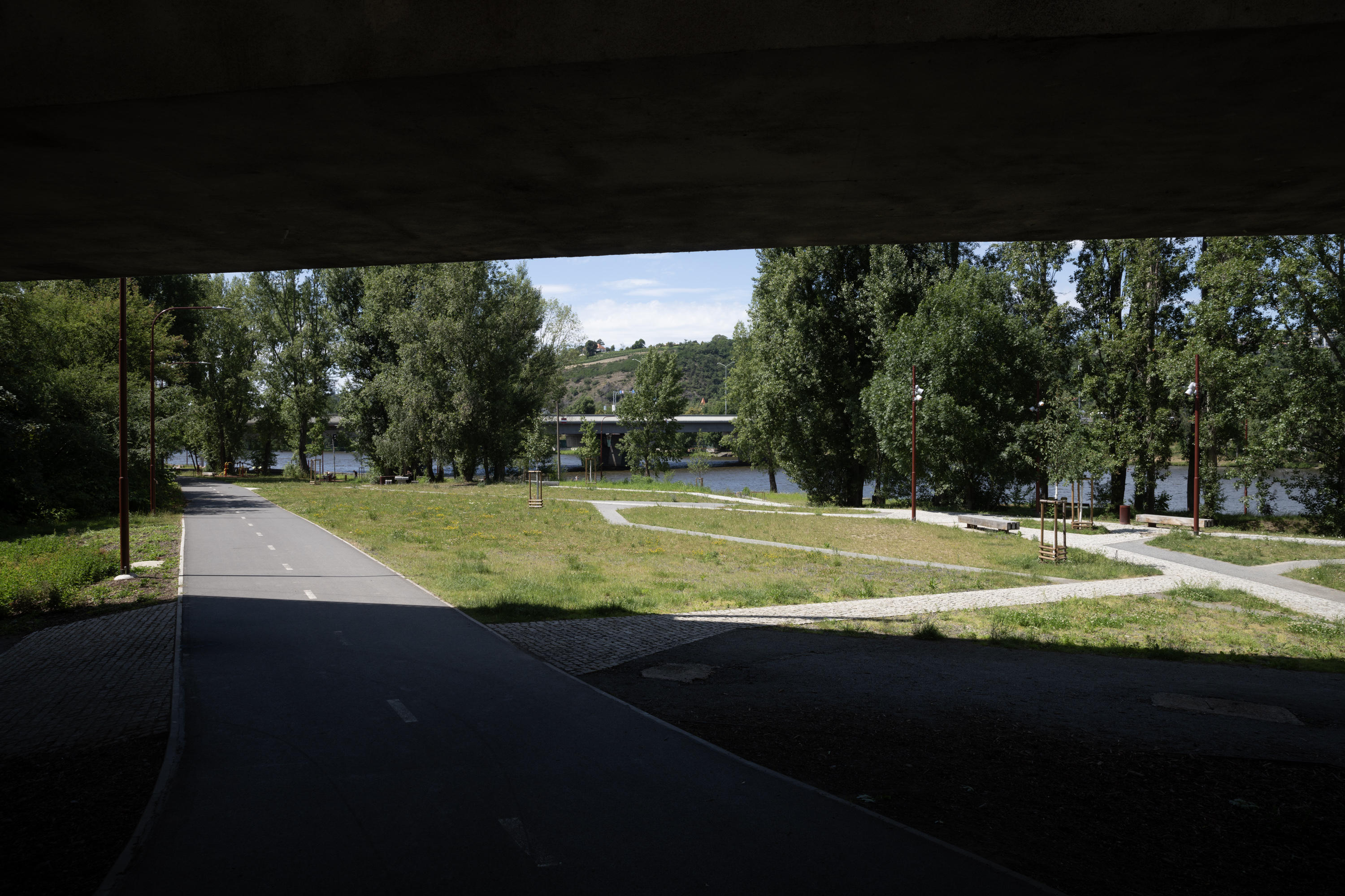 Jiná místa v parku si zase o zachování ve stávajícím stavu řekla sama, a to zejména kvůli mizerným půdním podmínkám. Pod 60 cm nekvalitního substrátu se totiž nachází buď zpevněné břehy Vltavy, anebo další vrstva betonových panelů, které znemožňují novou výsadbu. Přesto se i v těchto podmínkách dokázaly uchytit náletové dřeviny, které dnes prorůstají kolem vlečky, zatímco na břehu řeky se tyčí vzrostlé topoly. „Moc nechápeme, jak v těchto podmínkách dokázaly tak vyrůst,“ podotýká architektka, „nicméně to nejsou kvalitní stromy, které vám tu vydrží nějak dlouho. Nemohli jsme tak položit typický rastr pro park na třeba sto let, všechno se bude neustále měnit. Dnešní bezzásahové zóny budeme kontrolovat a postupně prořezávat, z nich pak vyroste nová generace stromů.“