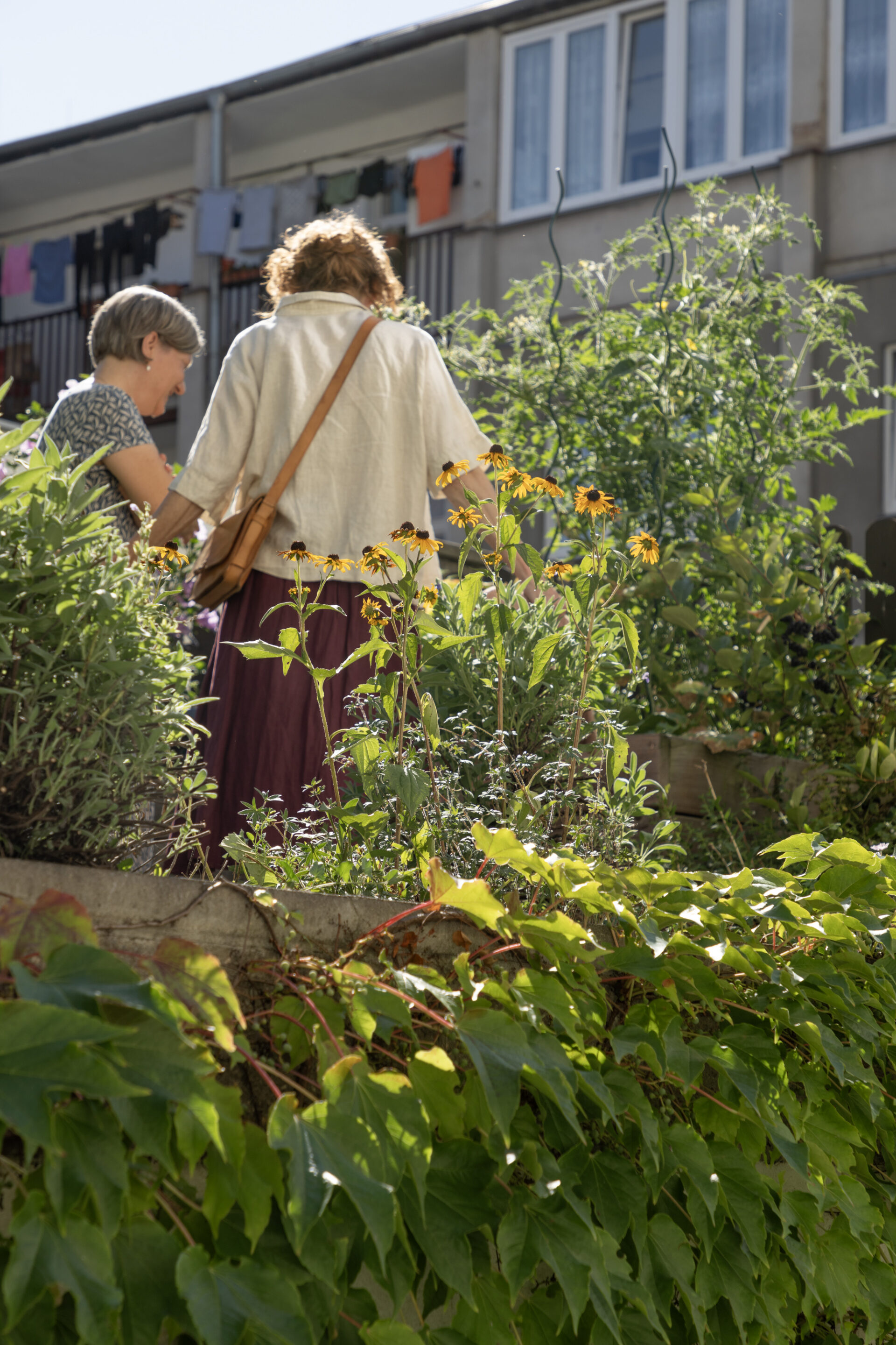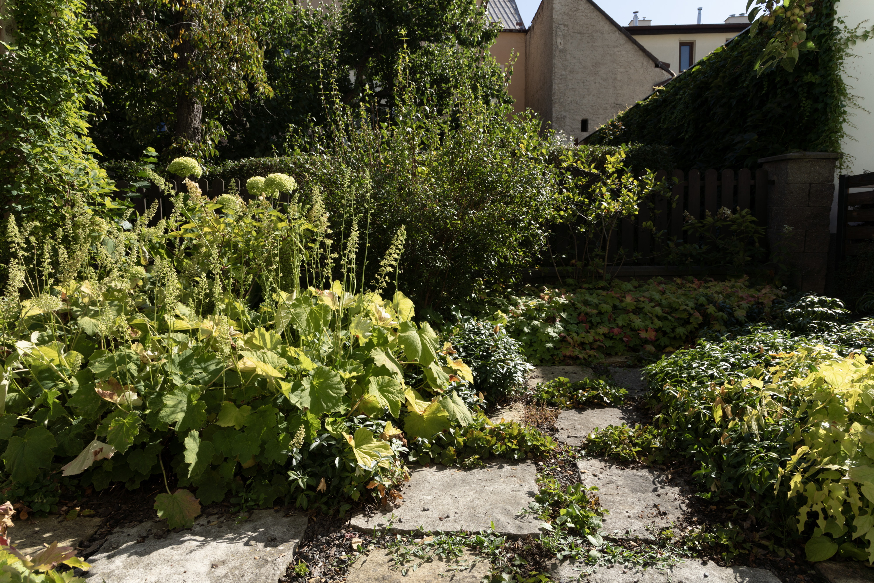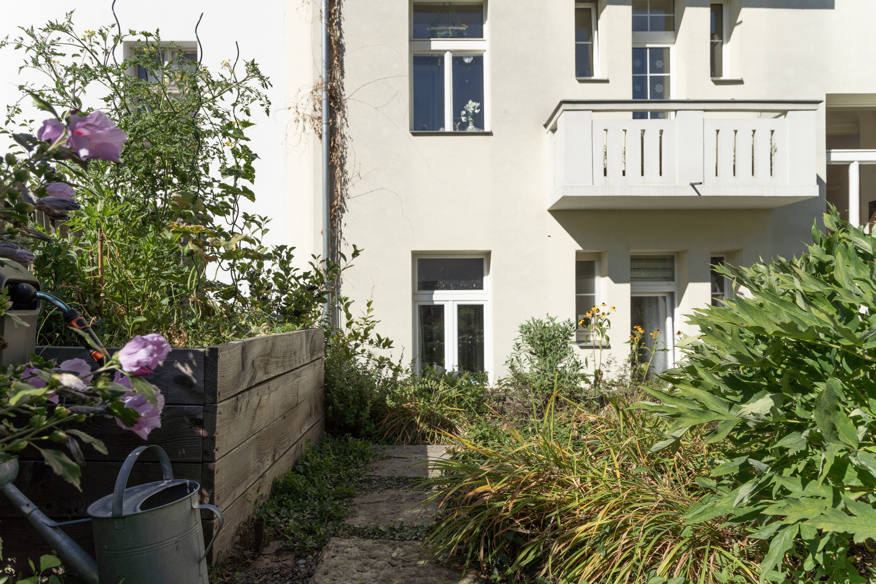 Participativně vznikal i projekt vnitrobloku Nad Sokolovnou. Iniciátory proměny byli manželé Vlčkovi, vlastníci bytového domu, kteří oslovili spolek Bieno se záměrem oživit zanedbaný dvůr a proměnit jej ve funkční a ekologicky aktivní prostor. Bieno zde převzalo roli facilitátora a mediátora mezi vlastníky, nájemníky*icemi a odborníky*icemi. Přístup spolku je založen na vyvažování vztahů mezi jednotlivými aktéry a na zapojení obyvatelstva do rozhodování o prostředí, v němž se pohybují každý den. Podněty místních sesbíralo Bieno během několika společných setkání. Jak zdůrazňuje facilitátor Michal Křivohlávek, nejdůležitější je nejprve zjistit, kdo z obyvatel opravdu chce něco změnit a kdo je ochoten o prostor dlouhodobě pečovat. Na základě těchto diskusí vzniklo zadání projektu, který měl propojit pobytovou kvalitu, ekologickou funkčnost a jednoduchou údržbu – tři základní pilíře udržitelné proměny městského dvora, respektive „živého vnitrobloku“. Výsledná proměna tak není jen estetickým či technickým zásahem, ale modelem „prostorové spravedlnosti“ (spatial justice) v malém měřítku – procesu, který obyvatelstvu vrací možnost aktivně se podílet na podobě města a současně přispívat k jeho ekologické i sociální resilienci. Odolná architektura Díky projektu revitalizace je nyní dešťová voda ze střech zachytávána do retenčních nádob a využívána pro závlahu vyvýšených záhonů. Vznikla pergola porostlá popínavkami, která poskytuje stín i mikroklimatickou ochranu, a kompost, jenž vrací živiny do půdy. Původní nepropustné povrchy byly zčásti odstraněny a nahrazeny vodopropustnou dlažbou. Prvky mobiliáře i drobná architektura vznikaly postupně, často formou společných brigád. Zároveň se ukázalo, že malé fyzické zásahy mohou mít dopad na pospolitost obyvatelstva: ti, kteří se dříve míjeli, spolu začali komunikovat a spontánně se zapojili do péče o prostor. „Najednou jsme viděli, kdo tu opravdu bydlí, kdo chce něco dělat. To je ta nejdůležitější část naší práce,“ shrnuje tým Biena.